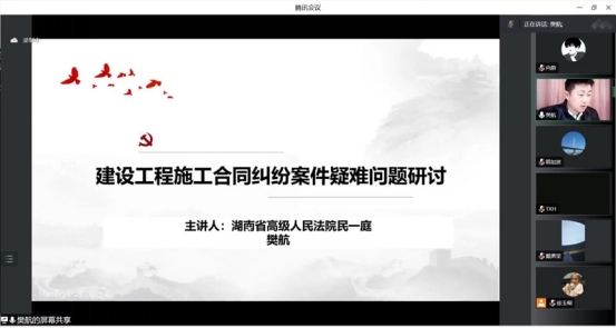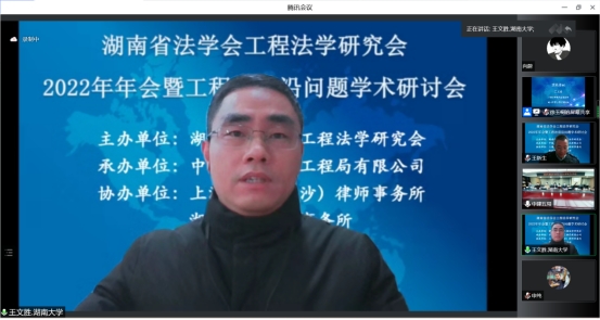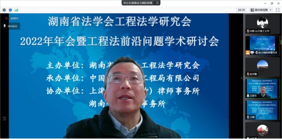 2022年12月4日,湖南省法学会工程法学研究会2022年年会暨工程法前沿问题学术研讨会在线上腾讯会议室隆重召开,本次年会由湖南省法学会工程法学研究会主办,中国建筑第五工程局有限公司承办,上海建纬(长沙)律师事务所、湖南金州律师事务所协办。来自湖南省高院、长沙市中院、长沙仲裁委、郴州市中院、中建五局、湖南建投集团、中国水电八局、五矿二十三冶建设集团、中铁五局、上海市建纬律师事务所、湖南金州律师事务所等司法实务部门以及省内高校等科研机构的百余名专家学者参加会议。