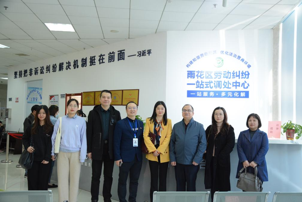 在雨花区人社局区副局长朱剑锋的带领下,我院领导、师生参观了“一台三室一区”的场所布置,了解了“前台、中室、后院”办事流程。调处中心将调解纠纷的触角向源头前移,使得劳动纠纷案件化解在萌芽状态,铸成了“守护打工人”的安全后盾。全链条劳动纠纷解决机制环环相扣,流程简单明了,功能强大丰富,将习近平总书记要求的把非诉讼纠纷解决机制挺在前面落到了实处,具有良好的法律效果和社会效果。