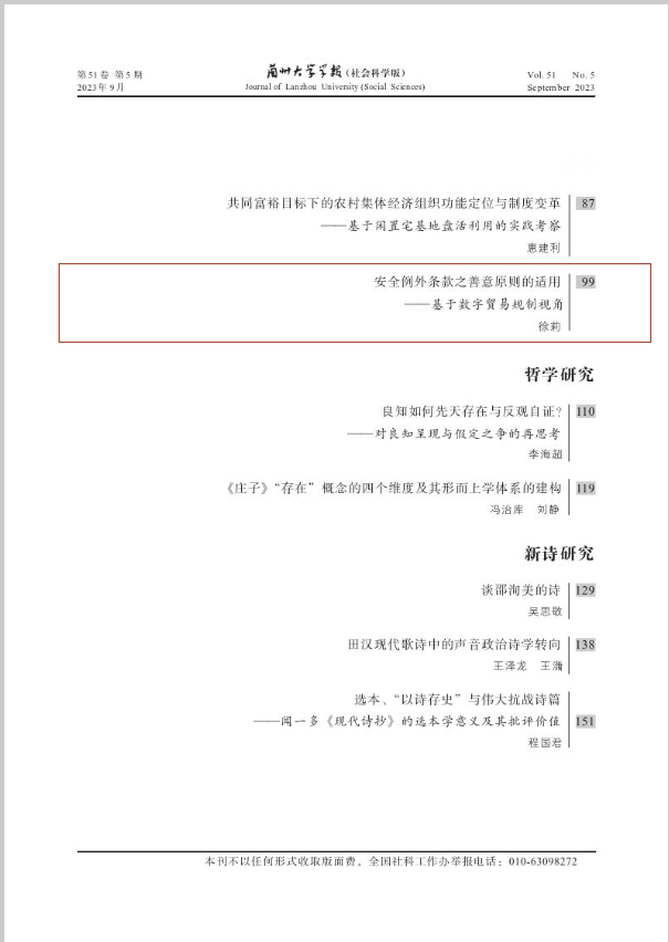 近日,william威廉中文官网法学院副教授徐莉在《兰州大学学报(社会科学版)》(CSSCI来源期刊)2023年第5期发表论文《安全例外条款之善意原则的适用——基于数字贸易规制视角》。