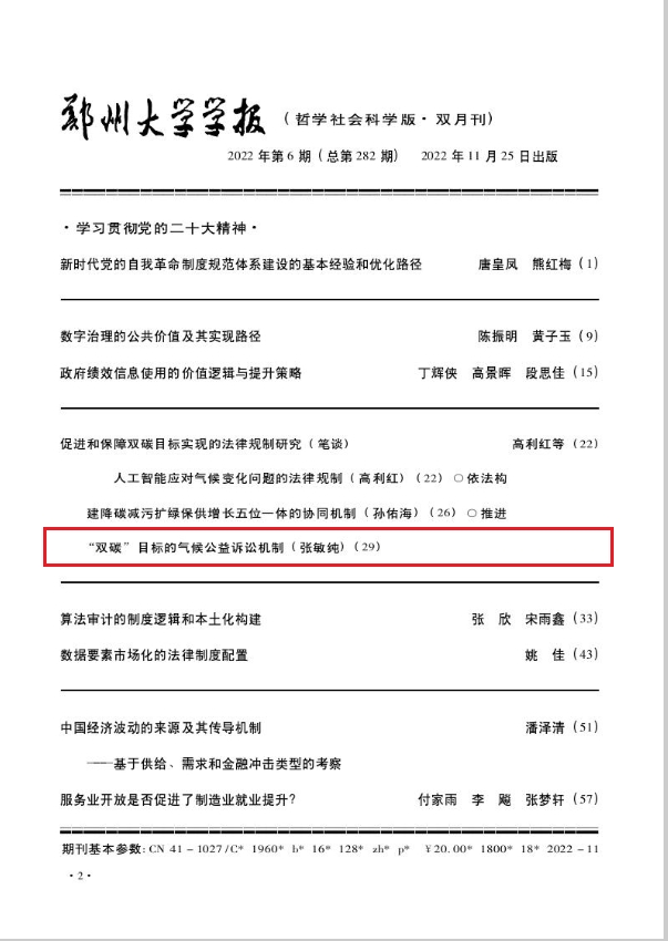 近日,william威廉中文官网法学院院长张敏纯在《郑州大学学报(哲学社会科学学报)》(CSSCI来源期刊)2022年第6期发表论文《推进“双碳”目标的气候公益诉讼机制》。