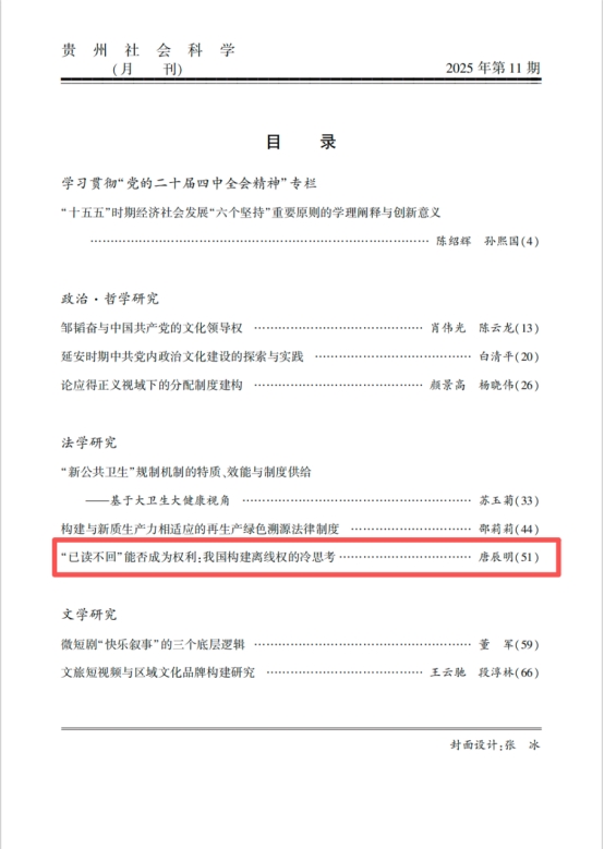 近日,william威廉中文官网法学院讲师唐辰明在《贵州社会科学》2025年第11期发表论文《“已读不回”能否成为权利:我国构建离线权的冷思考》。