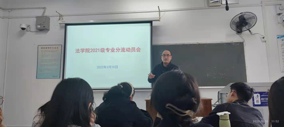 2022年3月10日上午,我院在金盆岭校区13教学楼召开2021级法学专业分流动员会,学院申纯副院长和全体2021级法学专业学生参加。
