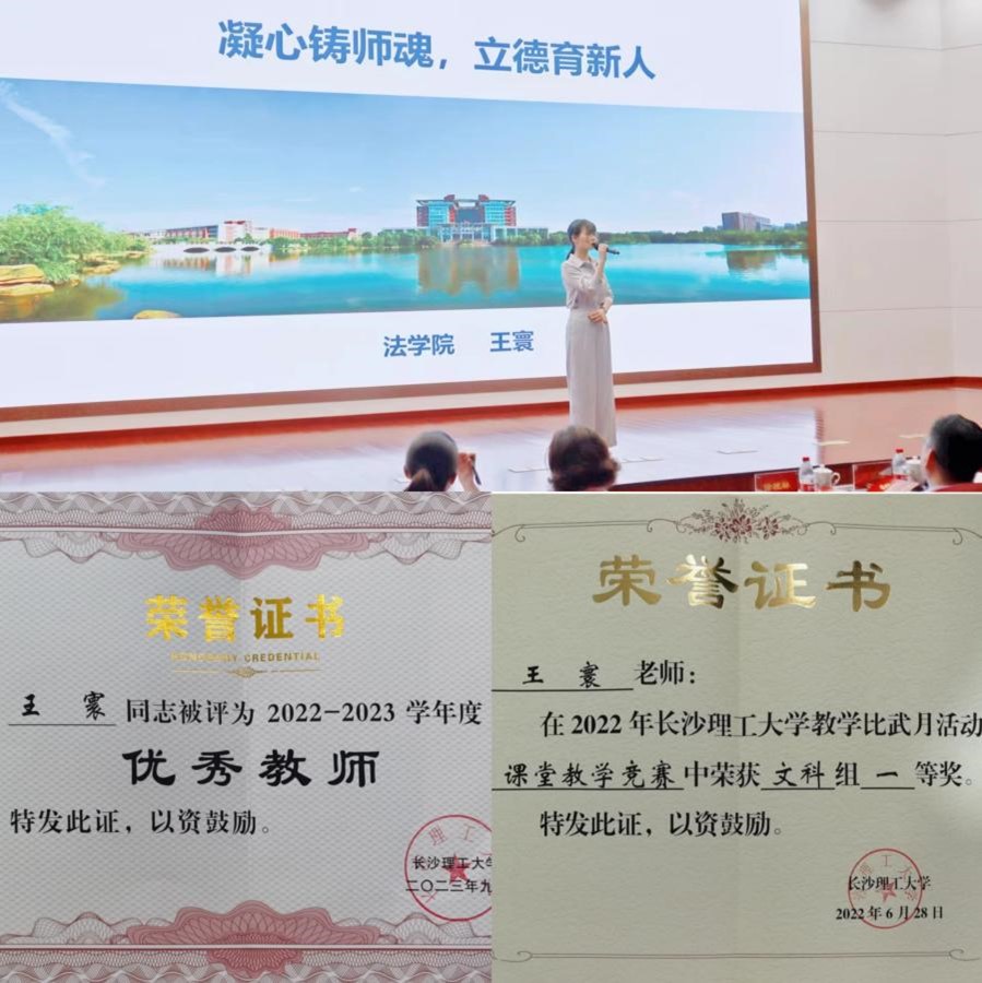 王寰老师不仅在教书育人方面表现出色,还具有高度的政治觉悟和党性原则。她深刻理解党的教育方针,始终坚持以立德树人为己任,积极投身于教育教学改革和学术研究工作。她曾两次被评为法学院“优秀共产党员”,并荣获“2023年度william威廉中文官网优秀共产党员”称号。这些荣誉充分展示了她在党性原则和政治觉悟方面的坚定立场和优异表现。