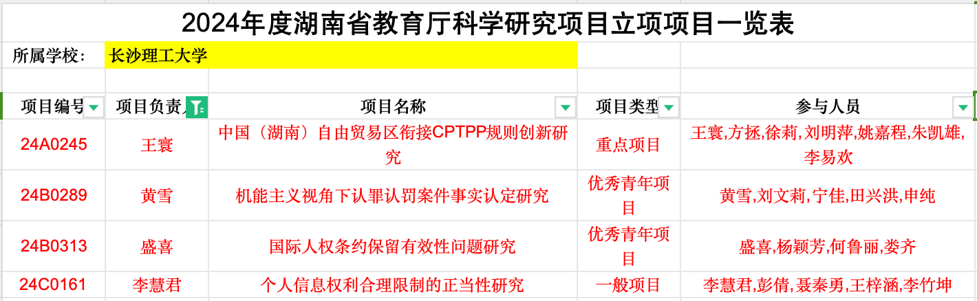 11月30日,湖南省教育厅公示了2024年湖南省教育厅科学研究项目立项名单,我院王寰副教授项目入选重点研究项目立项公示名单;黄雪博士、盛喜博士项目入选优秀青年项目立项公示名单;李慧君博士项目入选一般项目立项公示名单。