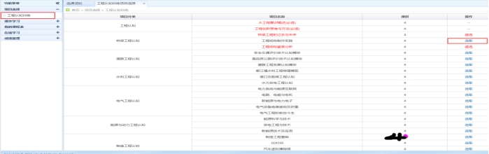3、选课操作如下图:登录后,先在左侧菜单栏点击“项目选择”,再点击课程 “工程认知训练”,右侧窗口弹出“工程认知训练项目选择”页面,该页面“项目分类”栏列出了13个项目类别;“项目名称”栏列出了43个项目,其中前两个是必修项目,后41个是选修项目(其中8个类别8个项目面向入住在金盆岭校区学生开课);“课时”栏列出了每个项目的教学时数。