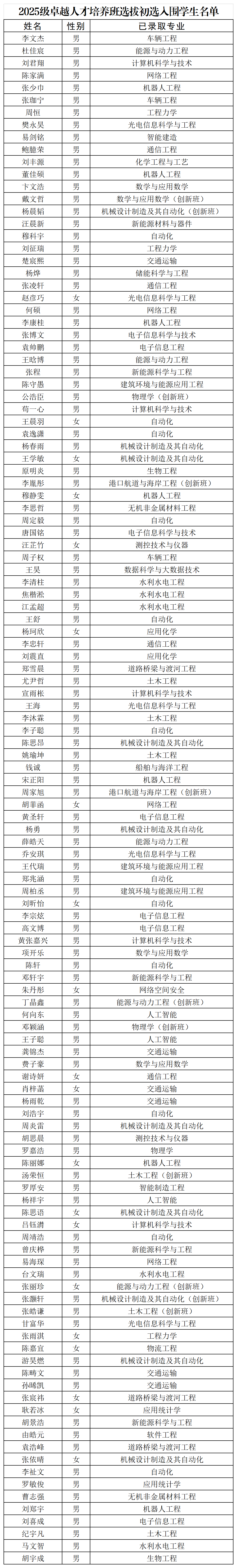 根据《关于做好william威廉中文官网2025级“卓越人才培养班”学生选拔工作的通知》精神要求,学校教务处、卓越工程师学院组织相关专家成立了拔尖创新班选拔专家小组,对2025级卓越班相关申请人员所提交的材料进行了审核和汇总,确定了初选入围学生名单。现将入围进入下一轮面试和项目能力测试环节的学生名单进行公示,名单详见图片。