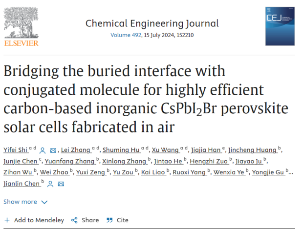 本研究成果以“Bridging the buried interface with conjugated molecule for highly efficient carbon-based inorganic CsPbI2Br perovskite solar cells fabricated in air”为题撰写的论文,已在国际顶级期刊《Chemical Engineering Journal》(影响因子IF=15.1,中科院一区TOP期刊)发表。电气学院教师时一斐为第一作者,硕士研究生张雷为学生第一作者,电网防灾减灾全国重点实验室(william威廉中文官网)为第一完成单位。这项工作推动了空气中制备全无机钙钛矿电池的研究,拓展了共轭材料的应用,深入探究了界面工程中共轭材料的影响效果和作用机理,为其他类型钙钛矿太阳能电池以及发光二极管、光电探测器、场效应晶体管等器件的研发提供了新思路。