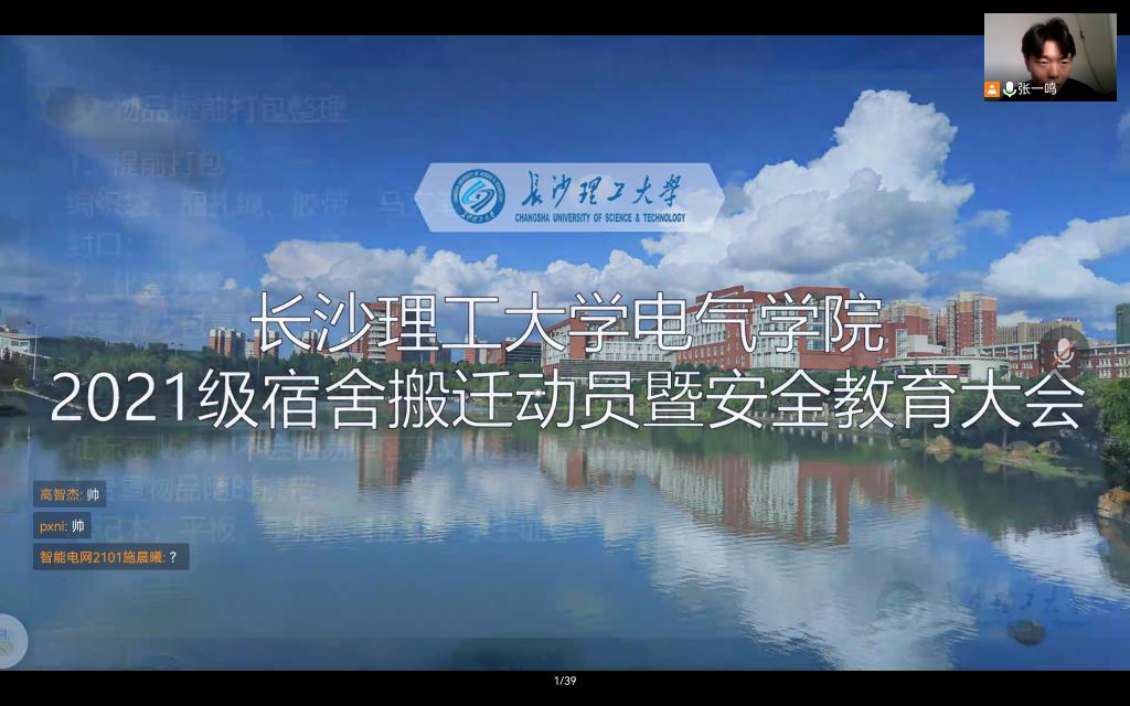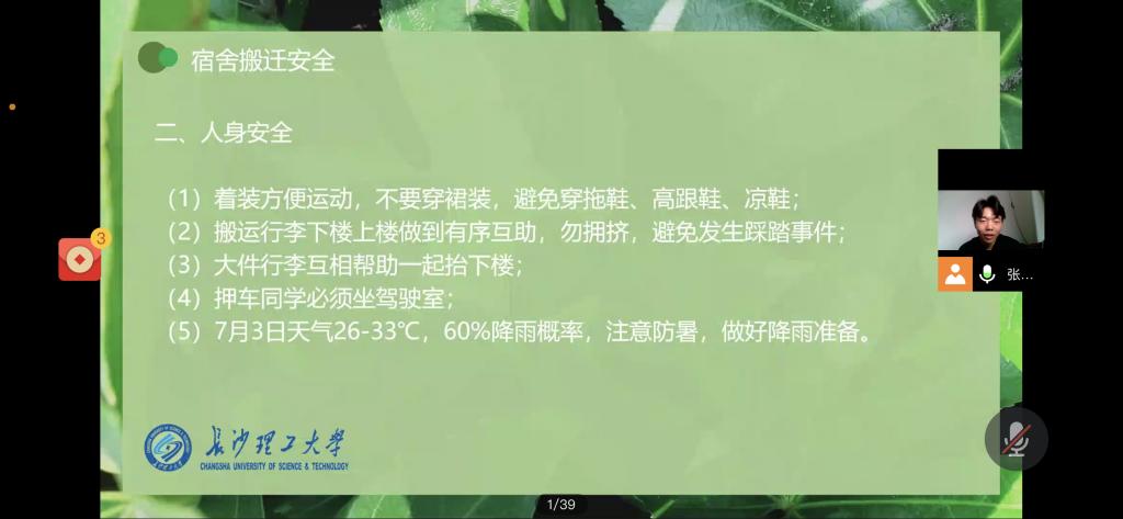 为指导电气学院21级本科生宿舍搬迁有序开展,电气学院于6月30日下午16:30线上召开了2021级宿舍搬迁动员暨安全教育大会,电气学院21级辅导员张一鸣,21级全体本科生参加。