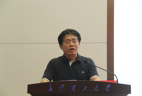 副校长钱国平讲话,他指出电气学院自2014年起组织暑期实践活动便形成了“思政引领,专业为基”的工作特色,是湖南大中专实践活动的一颗明珠。钱校长对即将出征的老师同学们表示亲切慰问,随后借习近平总书记之言“用脚步丈量祖国大地,用眼睛发现中国精神,用耳朵倾听人民呼声,用内心感应时代脉搏”,对实践队员提出三点建议:一是在实践中要增进对知识的理解,带着“对知识的疑问”参加社会实践,到广阔的实践中去寻找答案,实践出真知;二是在实践中要提高对劳动的认识,要通过亲身经历去体会问题的解决过程和价值的创造过程;三是在实践中要培养对基层的感情,去深入发现人民群众的淳朴、乡土社会的烟火、社会治理的堵点和建功立业的舞台。