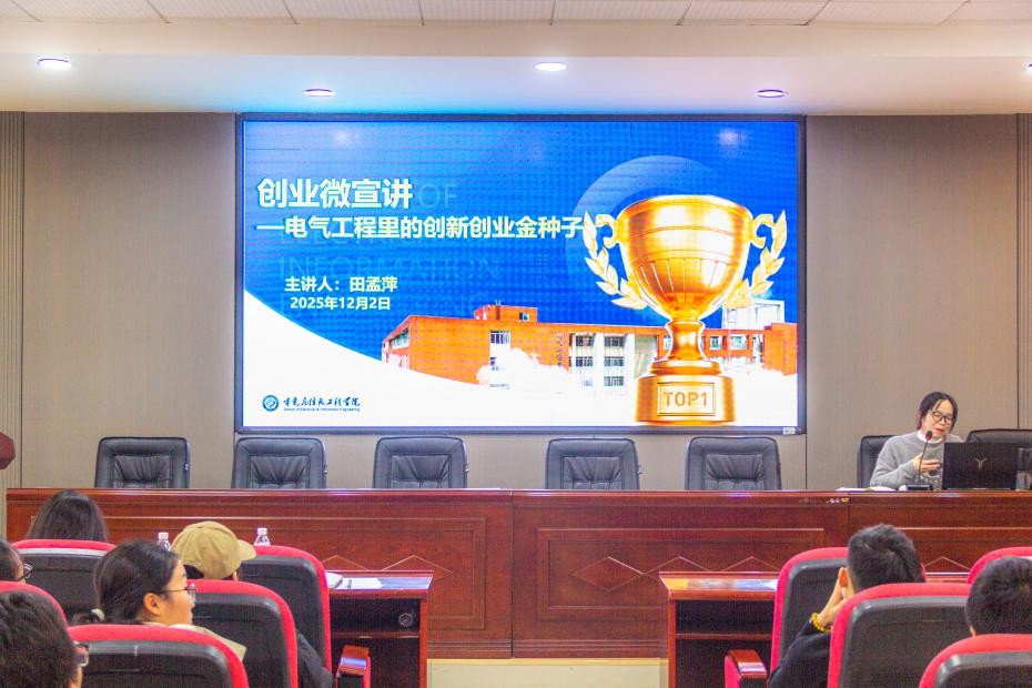 2025年12月2日15:00,电气学院在工科一号楼B503举办创业讲座(微讲坛)系列活动,本次讲座的主题为“创业微宣讲——电气工程里的创新创业金种子”,由多个创新创业类学科竞赛国奖、省奖项目指导教师、电气学院学工办主任田孟萍主讲,学院各年级学生代表参加。