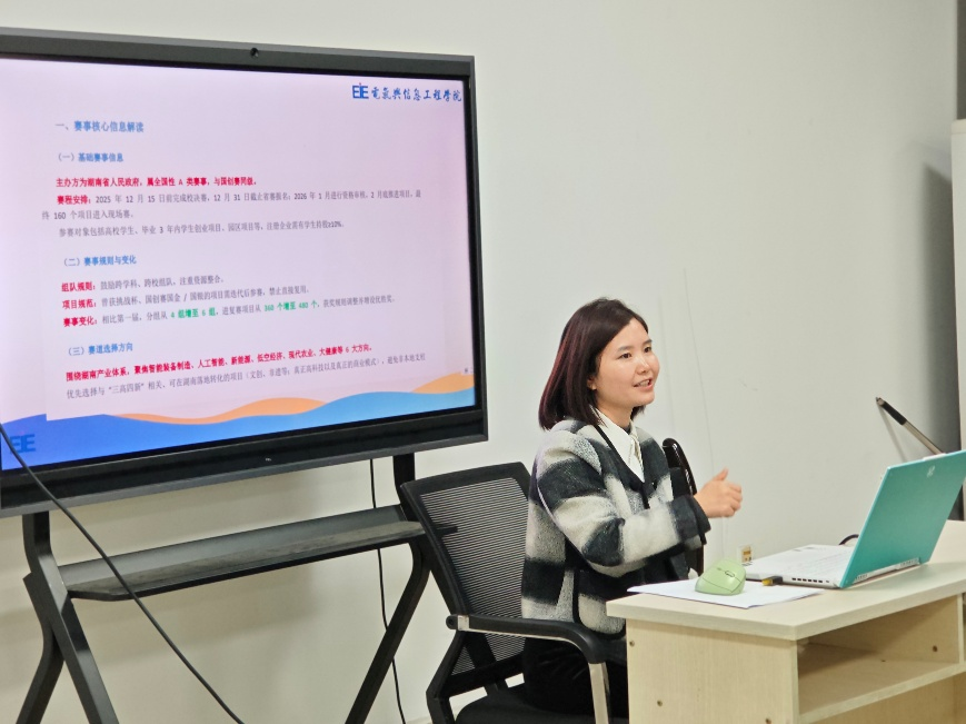 课堂上,楚艳鸽首先介绍了多项与专业特色紧密结合的重点赛事,包括“挑战杯”全国大学生系列科技学术竞赛、大学生创新项目策划大赛、全国大学生能源经济学术创意大赛、全国大学生节能减排社会实践与科技竞赛、湖南省“金种子”大学生创新创业大赛等。她从赛事主题、参赛流程、评审标准、奖项设置等方面进行了细致解读,帮助同学们对各类竞赛形成清晰认识。