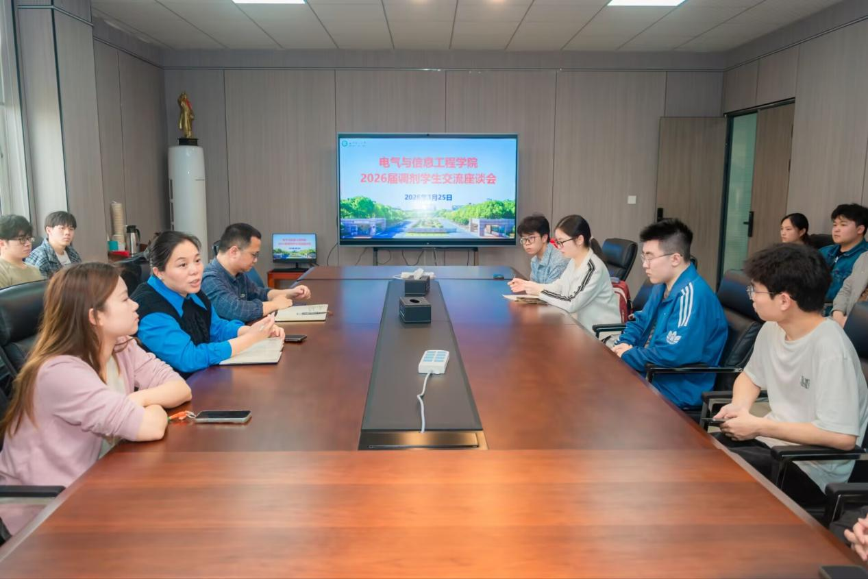 为精准助力2026届考研调剂学子把握政策、高效备考,4月8日,电气学院在工一B301-4召开调剂学生交流座谈会。学院党委书记丁丹、党委副书记周巍、2022级辅导员吴佳骐老师出席,与同学们面对面答疑解惑。