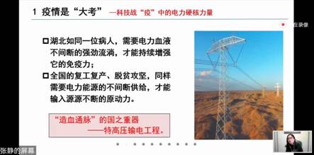 张静老师围绕“战疫保电,国网在行动”,分别从电力供应、物资供应、人员调配三个方面解读了国网的应对措施,重点介绍了火神山、雷神山等新建医院的输电保障过程,强调了湖北电网的战略地位,并引出了特高压输电工程对于国家能源输送的重要意义。