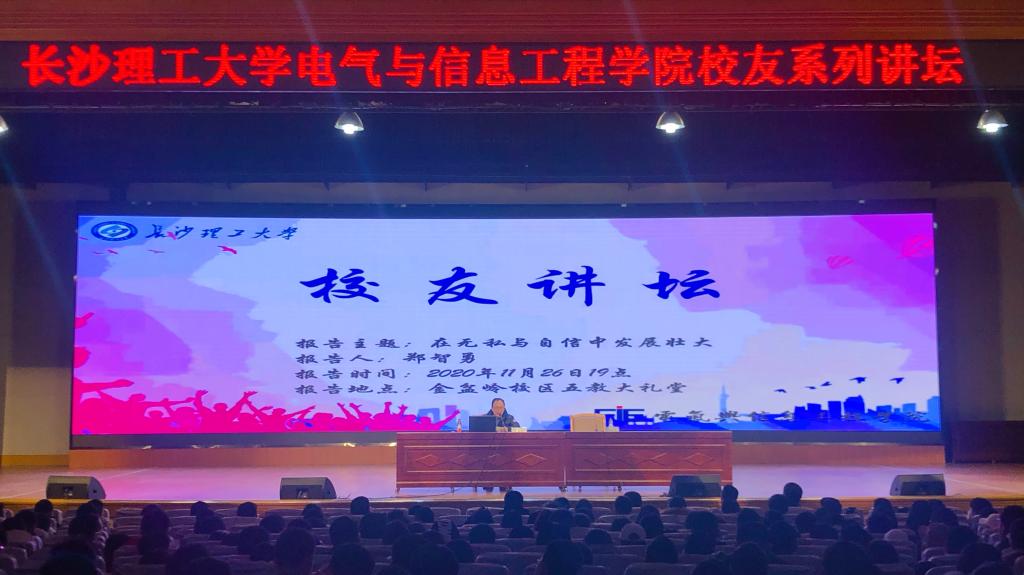 11月26日,电气学院在金盆岭校区5教大礼堂举行职业生涯规划人生大讲堂。特邀请长沙科智防雷工程有限公司董事长郑智勇作为主讲嘉宾,电气学院党委副书记任艮丰、2020级辅导员杨宸君、黄文韬及2020级新生参加本次活动。