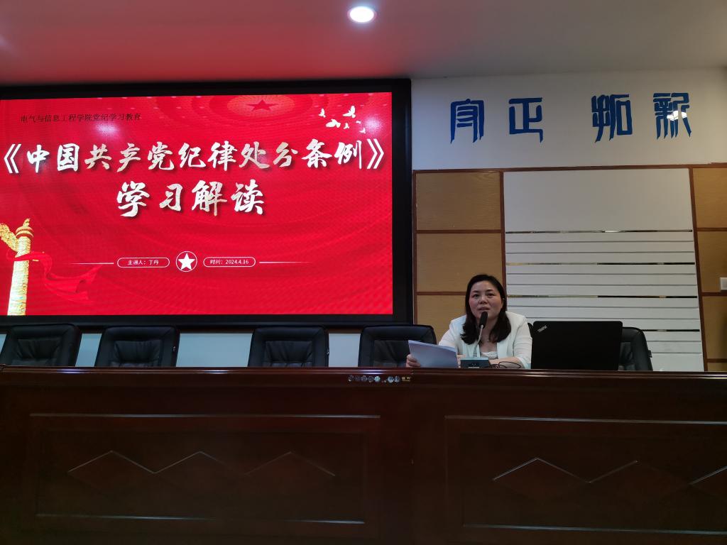 会上,丁丹传达学习了习近平总书记关于党纪学习教育的重要讲话和重要指示精神,传达了学校党委扩大会议精神,对学院党纪学习教育进行了部署,并通过对《中国共产党纪律处分条例》修订条文的解读进行了导学。