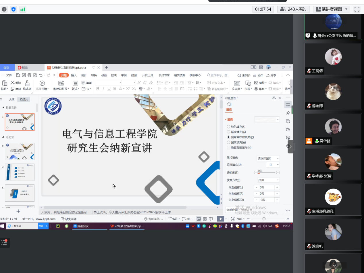 开启新学期,立足新起点,迈上新征程。8月23日晚18:30,电气学院线上召开2022级研究生新生答疑会暨院研会招新宣讲会。会议由研究生辅导员杨湘怡主持并答疑,电气学院院研会骨干及2022级全体研究生新生参会。