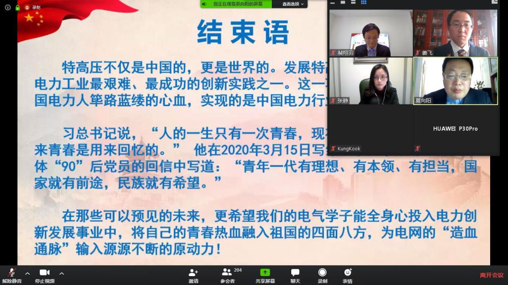 近日,电气学院的云上“党员讲坛”和“课程思政”正在进行中 。3月20日下午,电气学院面向全体研究生开展疫情下的专业思政课“光明点亮希望——电力战“疫”背后的特高压输电工程”,本次云课堂由副院长、博士生导师夏向阳教授牵头,姜飞、张静以及裴翔羽四位党员教师共同主讲。