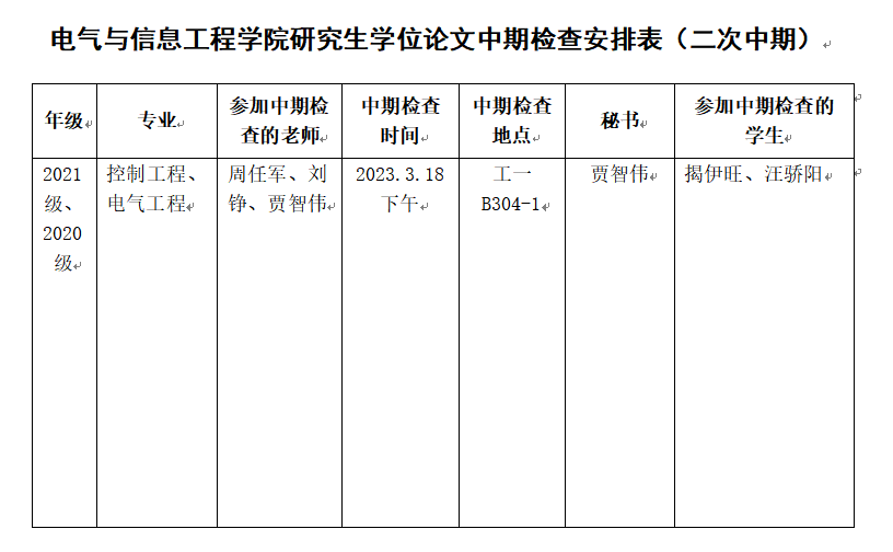 电气学院研究生学位论文中期检查安排表(二次中期)