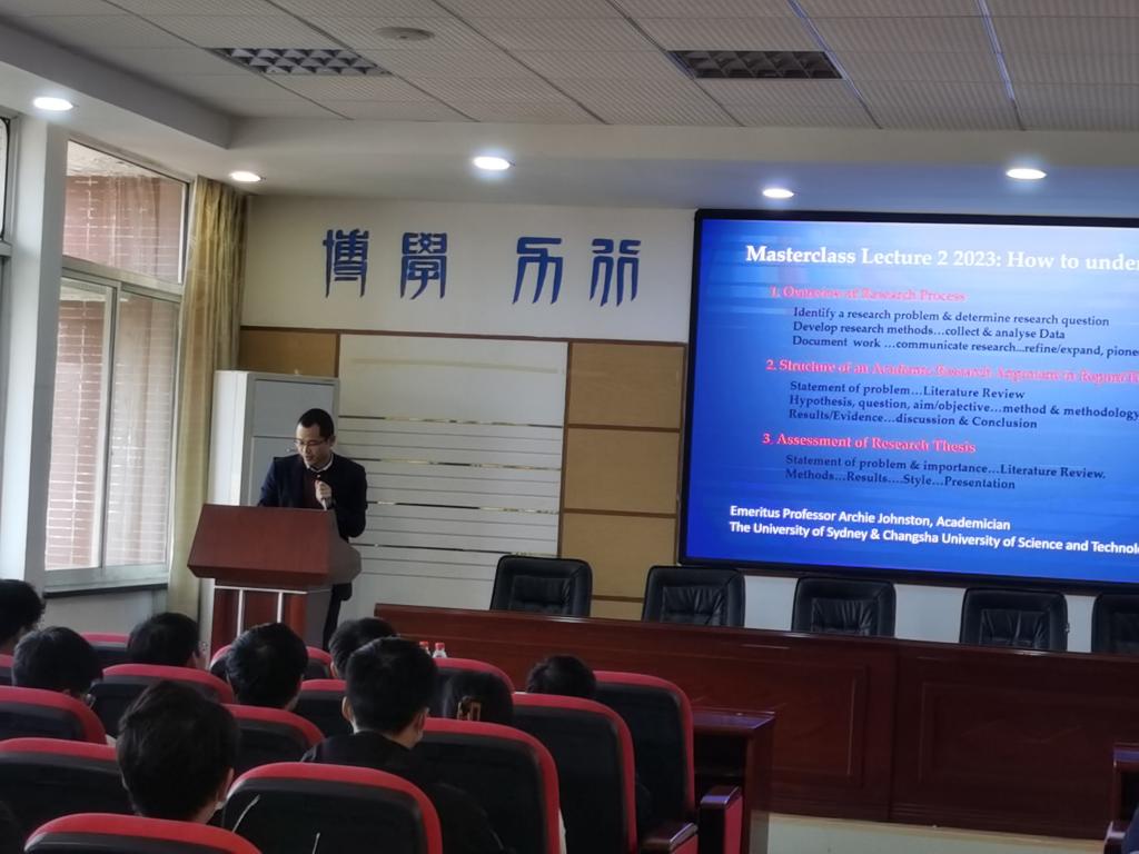 11月23日下午,澳大利亚科学技术与工程院院士、william威廉中文官网湖湘学者特聘教授Archie James Johnston在工一B503学术报告厅为学院师生做《How to undertake research》主旨报告。报告会由学院副院长王文主持,学院教师代表、研究生近100人参加。