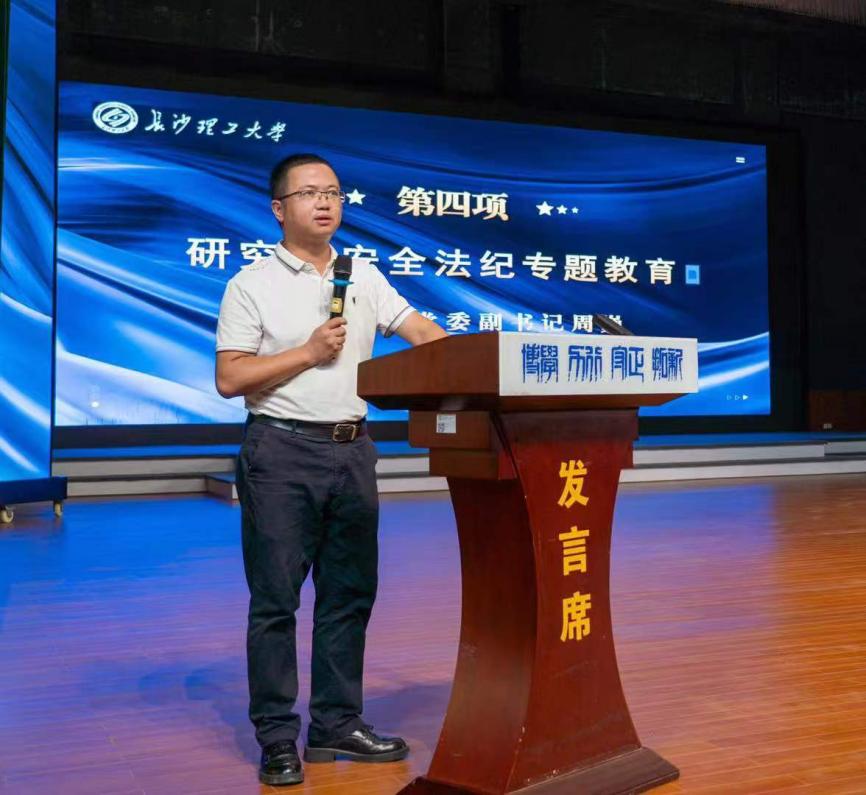 随后,周巍进行研究生入学教育和就业工作动员。周巍从人身安全、财产安全、消防安全、食品安全、网络安全和国家安全等六个方面,通过列举案例展开讲解。他强调,同学们要树立牢固的安全意识,做个人健康安全的第一责任人,维护学校学院形象与荣耀。