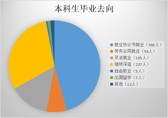 3.去向分布:细分为签就业协议、劳务合同、继续深造、灵活就业、出国留学、自由职业、其它(包括待就业或无就业意愿和拟深造)七个指标进行图标分析,具体情况如下图所示: