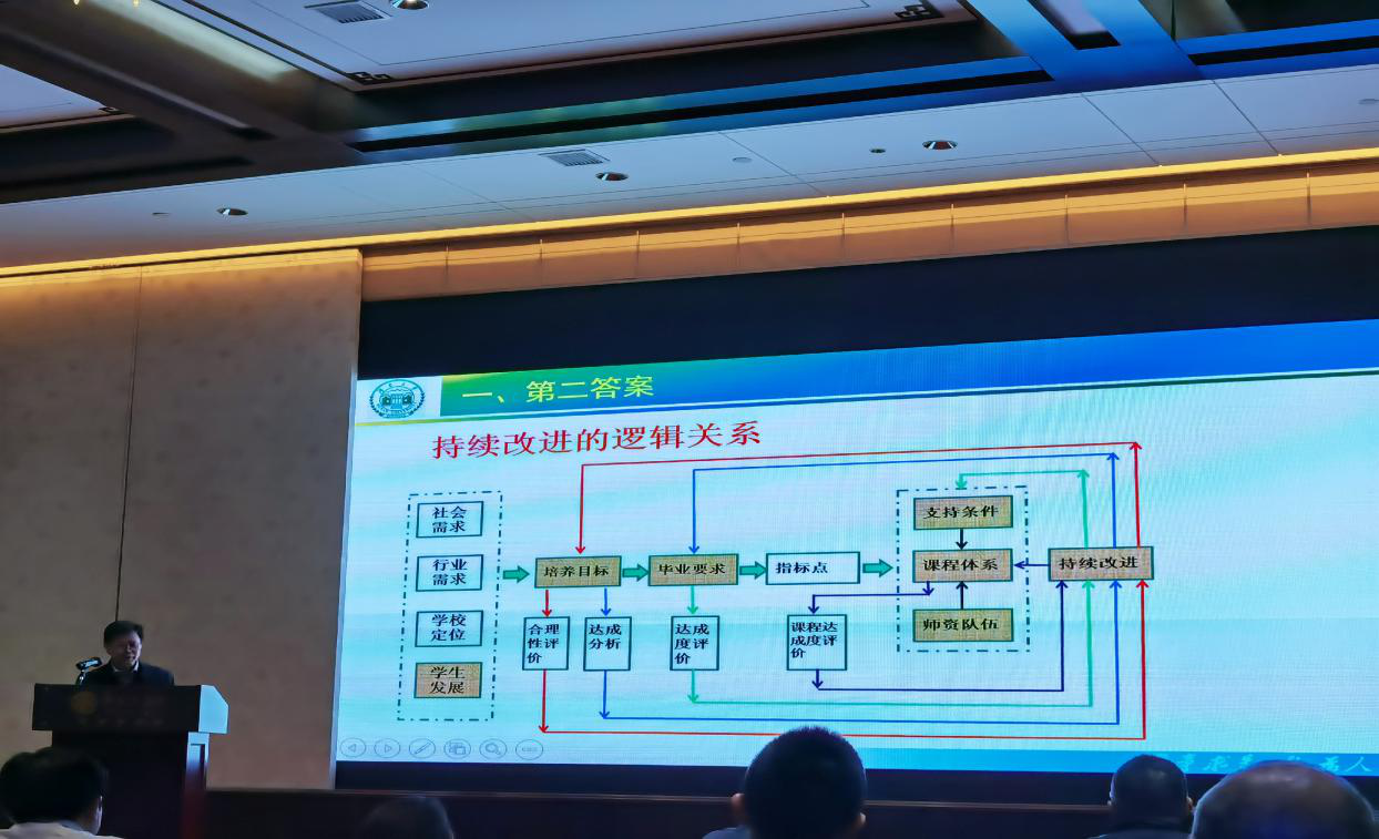 william曾祥君教授代表学校致欢迎辞。原湘潭大学党委书记、原湖南大学副校长章兢教授作了“基于反馈控制理论的教学持续改进”的主旨报告。他结合闭环控制系统,详细讲述了以学生培养目标为期望值,毕业要求作为主控制器、教学计划和课程大纲作为副控制器,实时根据课程目标、毕业要求、培养目标达成评价反馈,持续改进的闭环过程。