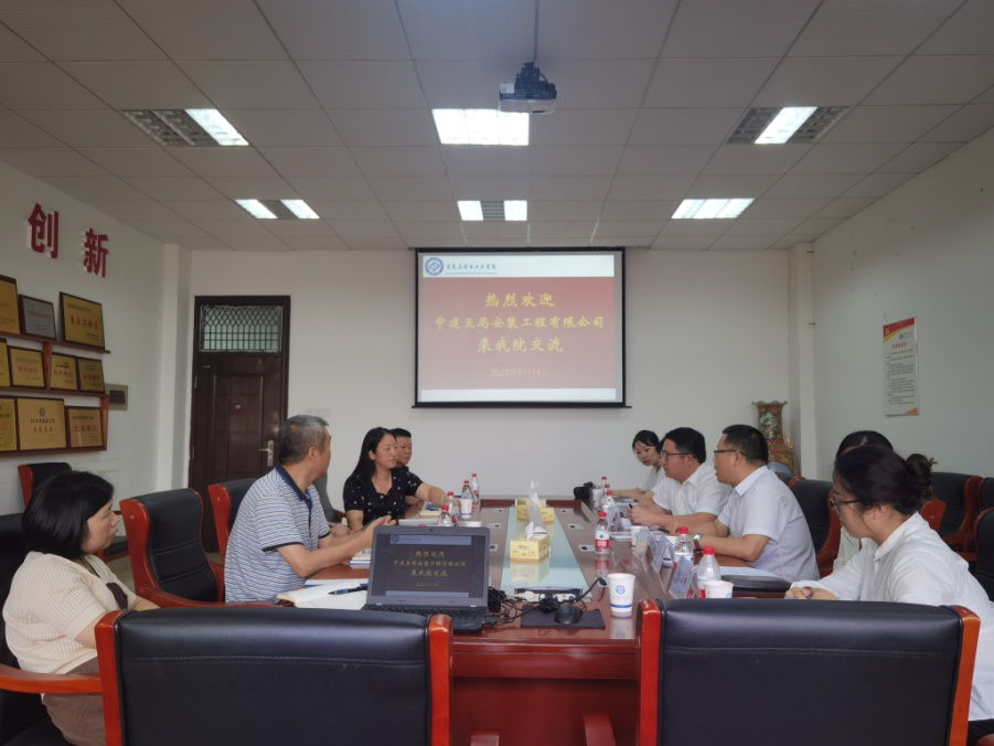 为进一步加强校企协同,积极推动双方在人才培养、党建联学联建、科技创新等方面的交流合作。9月14日上午,中建五局安装工程公司党总支副书记、工会主席柳书明一行来我院交流洽谈。学院党委书记伍接朝、副书记陶双及相关人员参加座谈会。
