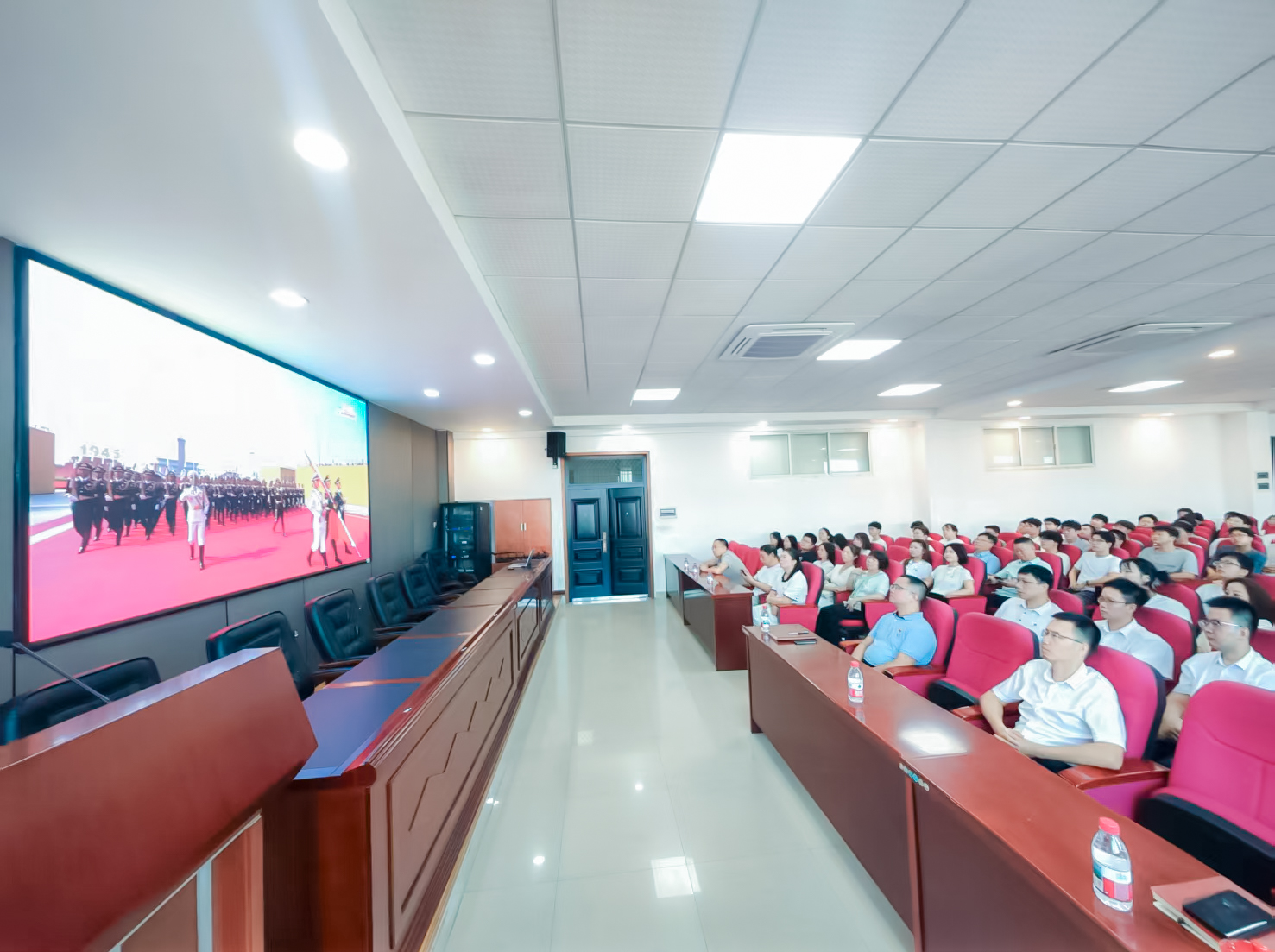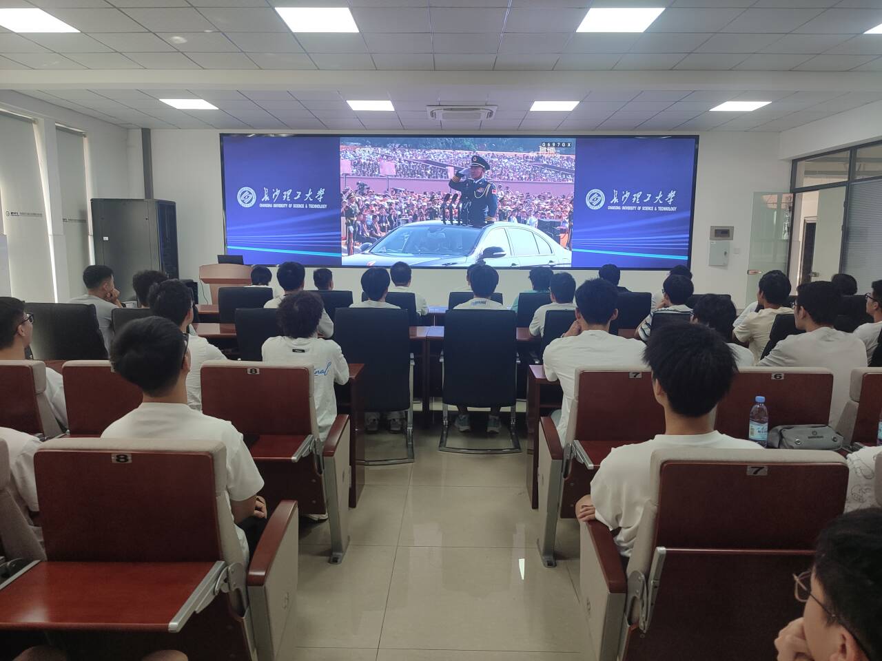 院领导、机关工作人员、系(党支部)负责人及学生代表在工一B503后街厅收看直播