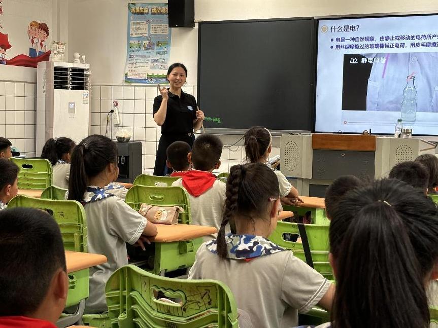 活动中,学院杨钰、周旋、钟俊杰、王沾四位教师为锦溪小学五年级同学开展了专题科普讲座,致力于增强学生们的科学用电常识。课堂上,老师们发挥专业特长,利用精心制作的安全用电知识PPT、科学试验视频、试验仪器,通过生动有趣的现场讲解、互助抢答等形式,向同学们深入浅出地普及安全用电知识,提升安全用电防范能力。