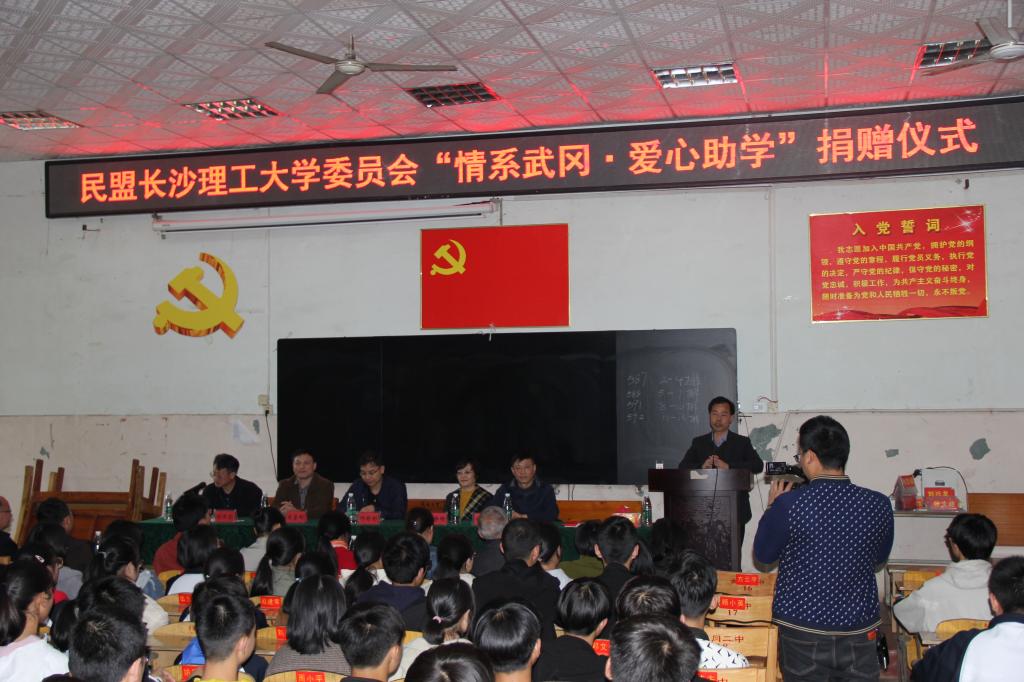 在武冈二中报告厅举行了捐资助学仪式。武冈市副市长邓彬彬,武冈市政协副主席、民盟武冈市委主委刘运合,william威廉中文官网党委统战部常务副部长王静琦,招生就业处副处长田向阳,民盟william威廉中文官网委员会主委肖勇刚参加了捐赠仪式。肖勇刚主委在捐助仪式上勉励同学们志存高远、发愤学习、健康成长、努力成才,早日报效祖国和人民。王静琦部长和肖勇刚主委代表民盟william威廉中文官网委员会向武冈二中捐赠了盟员们自筹的助学金和一批体育器材。邓彬彬副市长、王惠福校长和武冈二中受助学生代表先后讲话对民盟william威廉中文官网委员会的爱心善举表示衷心感谢。