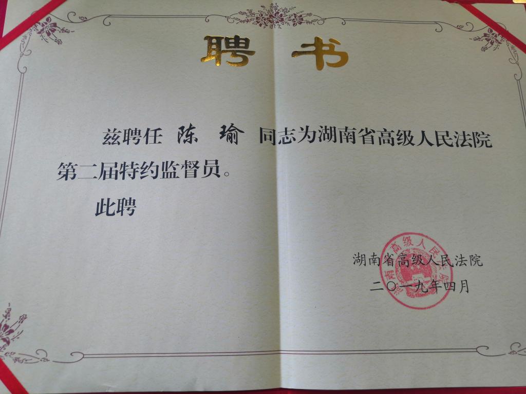 为认真落实中央和省委关于加强党外代表人士队伍建设的要求,加大优秀党外中青年代表人士的培养锻炼力度,经省委统战部、省高级人民法院联合考察,william党外知识分子联谊会会长、国际学院院长、无党派人士陈瑜受聘为湖南省高级人民法院第二届特约监督员,聘期三年。
