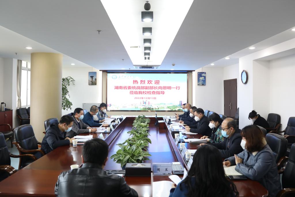 刘建民代表学校感谢向恩明一行来校检查指导。他表示,学校将坚决落实好中央和省委有关统战工作的精神和要求,切实提高政治站位,跟上新时代统战工作新要求,履行好统战工作主体责任,发挥统战功能作用,推动高校统战工作高质量发展,为决胜建成“百强”大学和全面建设社会主义现代化新湖南贡献智慧和力量。