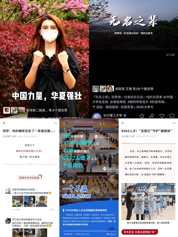 突出重点,加大疫情防控宣传力度。大力弘扬伟大抗疫精神,夯实校园宣传阵地,突出长理抗“疫”特色,在学校办公楼、教学楼、宿舍楼等各楼栋张贴宣传海报800余张,在校园LED屏等广泛播放防疫宣传标语口号,进一步扩大防疫宣传覆盖面。扎根各大媒体做好疫情防控对外宣传工作,在中新网、党建网、光明网、学习强国、湖南日报等媒体平台发布防疫对外宣传稿件共计151篇,其中中央级媒体报道41篇。校报推出“战‘疫’现场”专刊,全面深入宣传学校党委疫情防控方针政策,报道全校师生员工众志成城、齐心抗疫的感人故事。创新利用新媒体宣传方式,在微信微博、视频号、抖音等官方平台及时推送发布疫情防控相关信息,制作防疫宣传公众号推文12条,微视频7条,抖音6条,人物宣传海报9张。撰写疫情防控评论文章5篇。疫情防控宣传全媒体点击量共计超300W+。
