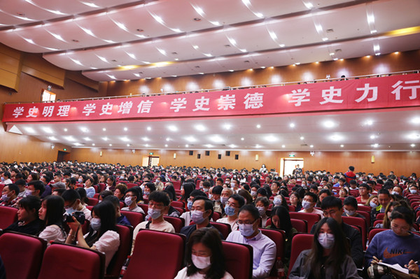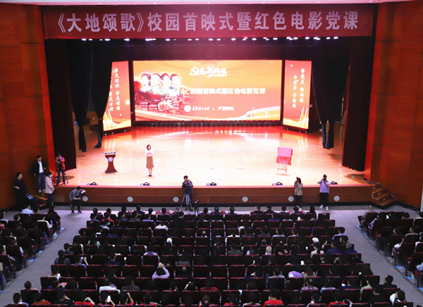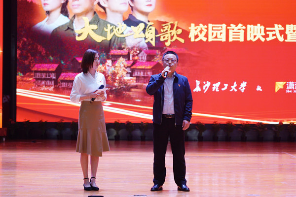 4月23日下午,《大地颂歌》长沙校园首映式在云塘校区大礼堂举行。省委党史学习教育领导小组办公室副主任、省社科院副院长汤建军,湖南广播影视集团(湖南广播电视台)党委委员、副总经理、潇湘电影集团党委书记、董事长谷良,william党委书记付宏渊及全体在家校领导出席首映式,全校千余名师生共同观影。