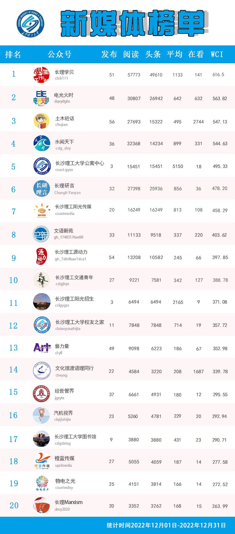 校属单位微信公众号排名(2022年12月)