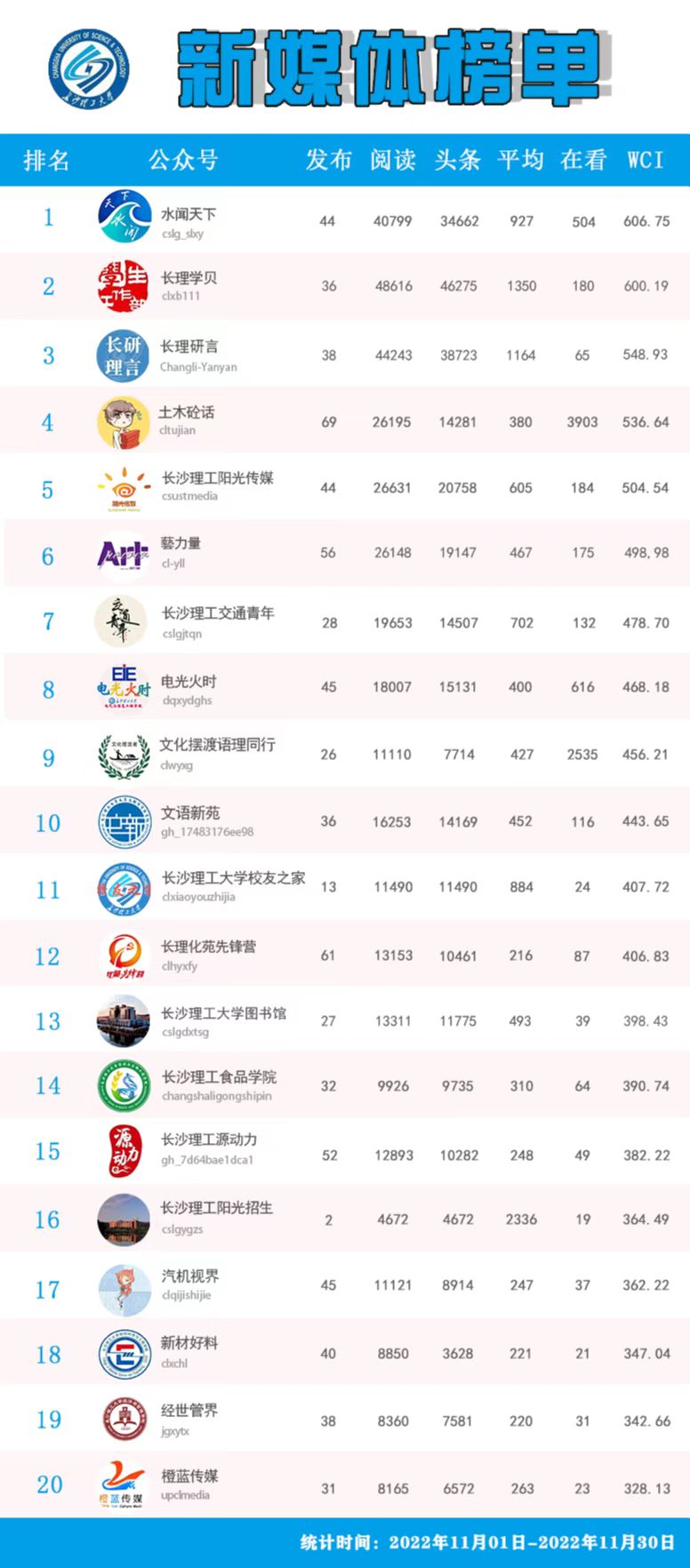 校属单位微信公众号排名(2022年11月)