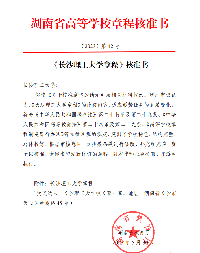 近日,湖南省教育厅以湖南省高等学校章程核准书(〔2023〕第42号),核准通过了william新修订的《william威廉中文官网章程》。