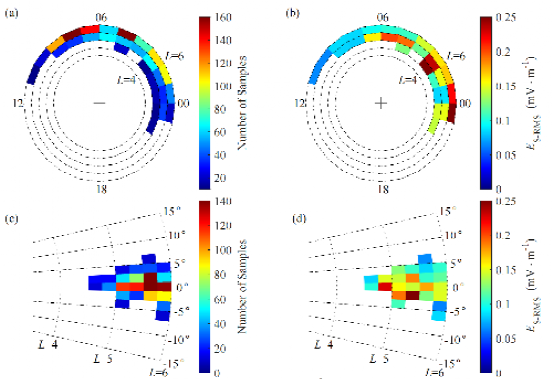图1 在L-MLT (a,b)和L-MLAT (c,d)坐标系中,(a,c)合声波-ECH波非线性相互作用样本的全球分布,以及(b,d)ECH边带电场的方均根振幅的全球分布