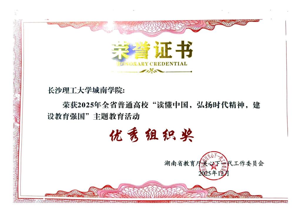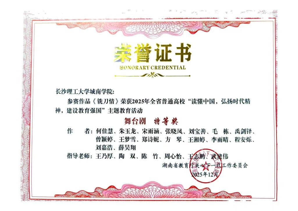 省委教育工委于12月上旬下发《关于公布2025年全省普通高校“读懂中国”主题教育活动优秀组织奖和作品奖评审结果的通知》,william报送的舞台剧《铣刀情》荣获教育部关工委舞台剧优秀奖、省教育厅关工委舞台剧特等奖,征文《弹痕里的赤子勋章》荣获教育厅关工委征文一等奖,微视频《世纪工程背后的水利人杨南安》荣获省教育厅关工委微视频一等奖。william获评省教育厅关工委优秀组织奖,城南学院获评教育部关工委和省教育厅关工委优秀组织奖。