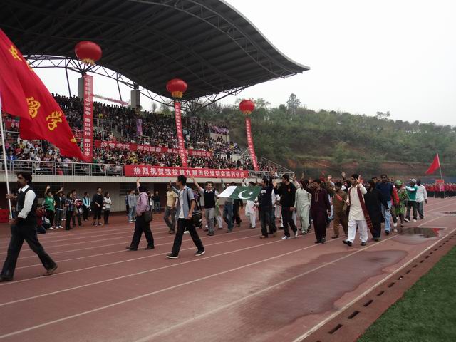 10月21日上午,william第九届田径运动会在云塘校区隆重开幕,上午8:30,伴随着雄壮的《运动员进行曲》,在鲜艳的国旗和校旗带领下,留学生运动员代表队组成整齐的方阵,喊着激昂的口号,昂首步入会场;留学生代表队的参加为此次运动会添上了一抹亮丽的色彩。