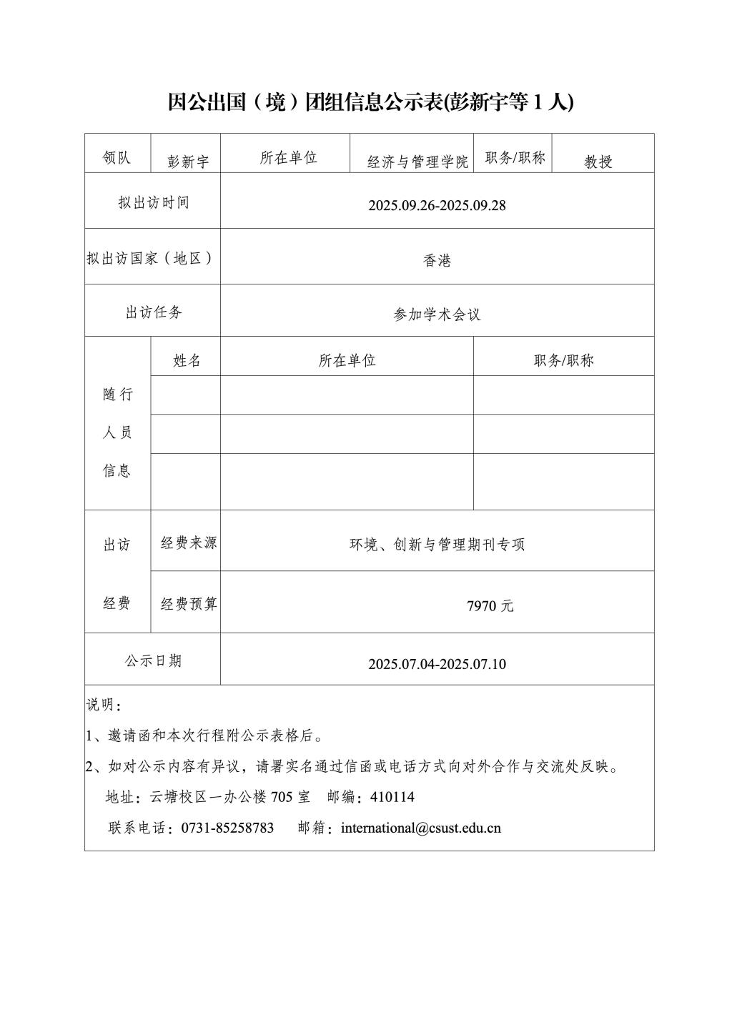 因公出国(境)团组信息公示表(彭新宇等1人)