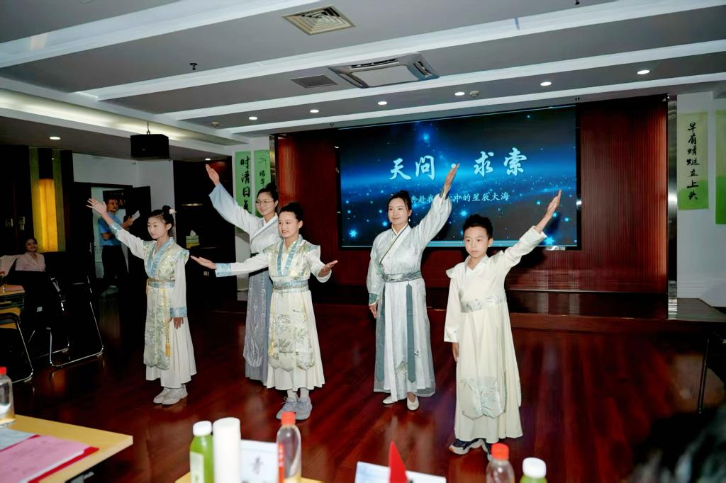 《天问·求索》由学院分工会主席黄文卫老师与欧彩玲老师,陈朵拉、章欧恬、陈颢宁3位孩子共同演绎。该节目的选题精准呼应了“传统节日”的主题内核。屈原以其对天地、历史、人生的磅礴发问,集中展现了华夏先贤探求真理的伟岸风骨与深沉家国情怀。节目在端午节前夕演绎,不仅是对伟大诗人的深情纪念,更是对大学所肩负的“求索”真理、培育时代新人使命的深刻呼应,彰显了文化自信的时代强音。其亲子朗诵形式,巧妙融合了家庭温情与传统文化的双重纽带。父母与子女在经典诗文的同频诵读中,不仅深化了亲子情感互动,更将屈原“路漫漫其修远兮,吾将上下而求索”的执着精神,化作润物无声的家教传承,为下一代注入了深厚的文化认同与价值引领。为呈现最佳效果,三组家庭挤出周末与工作日晚上的休息时间进行排练,反复打磨情感表达与配合默契度。表演现场,孩子们清澈而坚定的童声与两位母亲沉稳有力的诵读交织共鸣,赢得了热烈掌声。