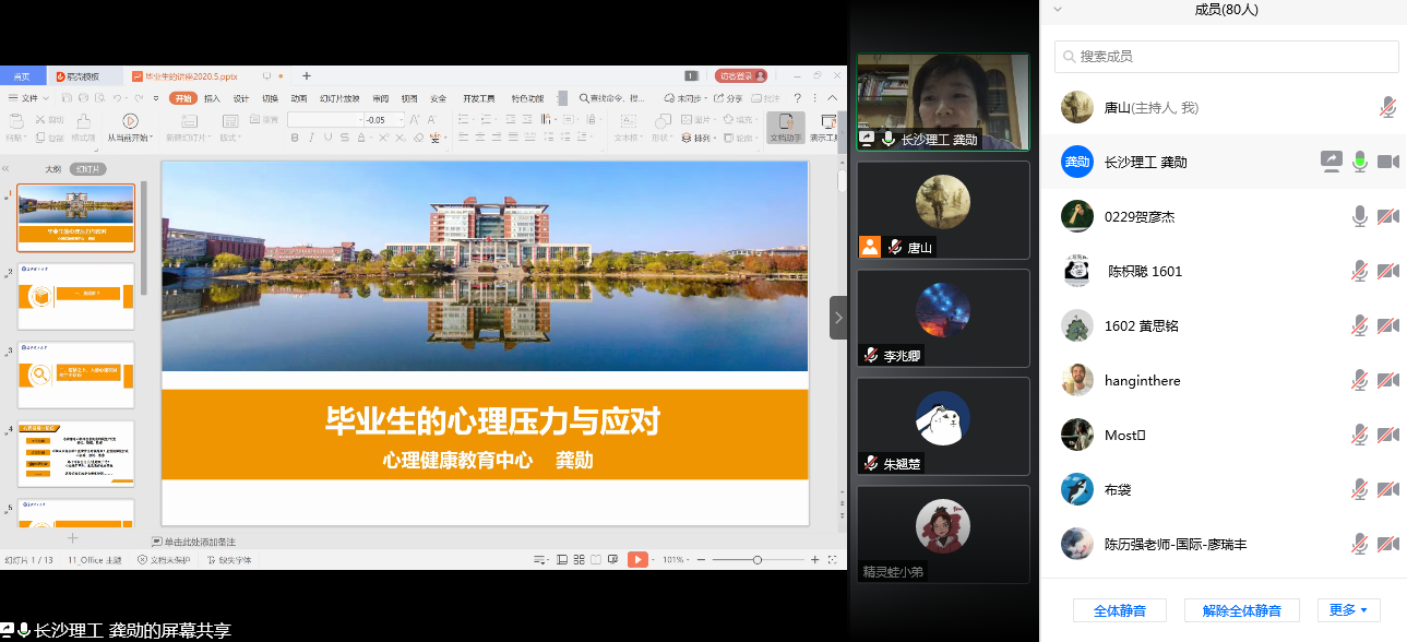 龚勋主任分析了毕业生所面临的心理压力,并指导学生应当采用的应对方案。首先,龚勋主任分析了此次疫情可能会给我们带来的影响,并指出了疫情之下,人们心理发展的三个阶段。在此基础上,龚勋主任继续分析了后疫情阶段,毕业生的心理状况,并提出了解决方案。其次,对于毕业年级学生所面临的各种客观问题与压力:例如,就业、考研等,大家应该改变态度、学会求助,与同学和老师一起分析自身压力。随后,对于那些难以解决的问题与压力,同学们可以找专业人士进行开通疏导,并留下了“湖南省高校疫情心理援助平台”以及“william威廉中文官网线上心理服务平台”的联系方式,给有需要的学生提供帮助。最后,龚勋主任指出,面对生活中的各种变化,我们一定要积极地调整自己的心态,聚焦于当下我们能够做到的事,对自己不要有过度的要求,这样我们才能够调整好自己的心理与情绪,平稳度过这个特殊的毕业季。