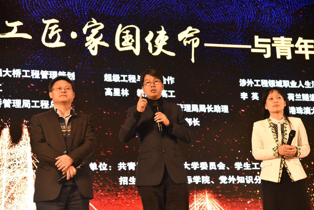 一桥飞架三地,天堑变通途,当港珠澳大桥宏伟的身段,频频闪现在william威廉中文官网云塘校区大会堂的屏幕上时,伴随着的是长理师生阵阵欢呼……4月3日晚7点,国际学院、共青团william威廉中文官网委员会、学生工作部(处)、招生就业处、党外知识分子联谊会等共同举办的“大国工匠·家国使命”——港珠澳大桥建设者与长理青年学子面对面活动成功举行,william92级校友港珠澳大桥工程总监张劲文教授级高工以及港珠澳大桥管理局局长助理高星林教授级高工、荷兰隧道公司(TEC)中国首席代表李英博士作为主讲嘉宾莅临活动现场,william威廉中文官网副校长蒋昌波教授、副校长刘扬教授、校党委委员兼国际学院党总支书记付嫦娥教授、相关职能部门和学院负责人、校党外知识分子联谊会理事、国际学院全体师生以及其他学院学生共计1500余人聆听了讲座。