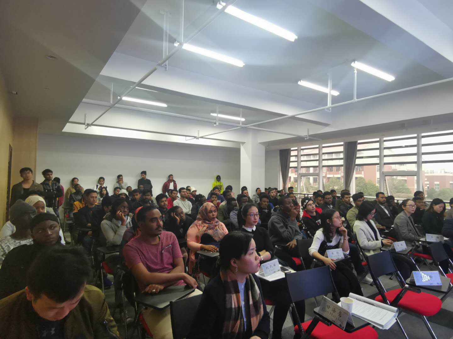 接下来彭建新、李彦、贺湘宇和汉语国际教育教研室李璐四位老师分别就土木工程、食品工程与科学、机械设计制造及自动化三个专业和汉语课程学习为新同学们做了学科介绍和就业预期分析,让大家对自己即将进行的专业学习和汉语课程安排有了一定的了解和认识。