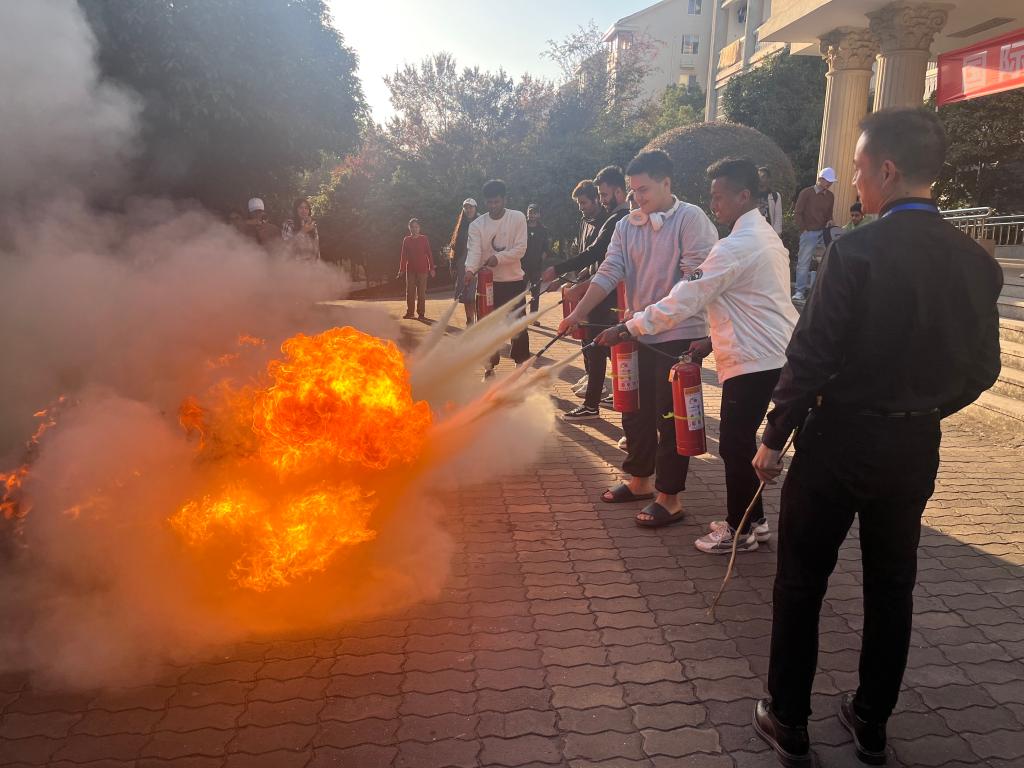 随后,王教官及保卫部工作人员组织学生进行消防逃生演练和灭火演练,讲解火灾逃生和正确使用灭火器的方法。