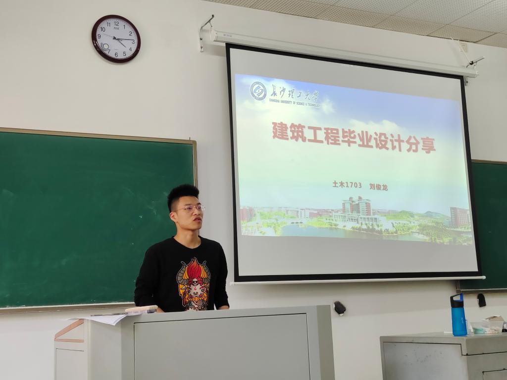 随后,罗帅结合毕业设计专项问卷调查结果、中期答辩表现以及指导教师反馈等方面介绍了毕业设计的整体情况。刘俊龙、丁山、熊轩宇、廖康元等四位同学分别代表建筑工程、桥梁工程、岩土工程以及道路工程四个设计方向,分享了自己两个月来毕业设计的主要工作和心得体会。秦卫星通报了学校毕业设计工作的整体要求和后阶段的重点工作,对目前同学们遇到的主要困难给出了解决建议,要求大家及时做好中期答辩后毕设成果整改,积极主动和指导教师沟通交流,严格按照毕业设计任务书要求做好毕设收尾工作。