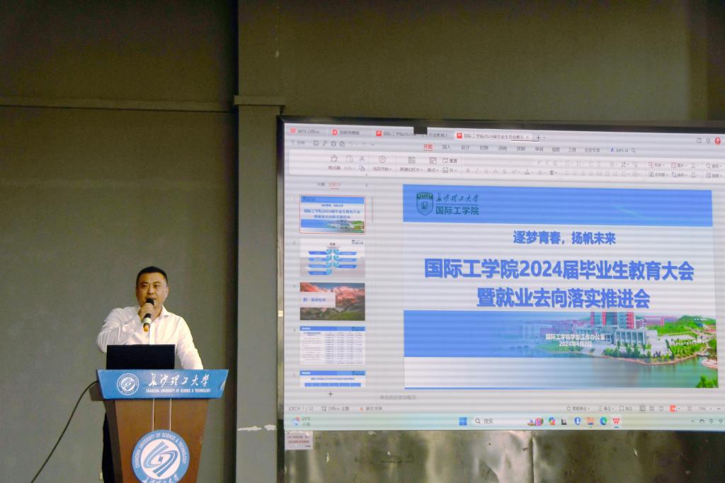 为更好推进学院2024届毕业生各项工作,帮助2024毕业生圆满完成本科阶段学业,4月2日上午,学院在云塘校区学生活动中心报告厅组织召开了2024届毕业生年级大会。国际工学院党委副书记兼副院长乔法光、教务办主任余志、年级辅导员唐宏敏、教务办相关老师以及2024届全体毕业生参加了本次会议,会议由余志主持。