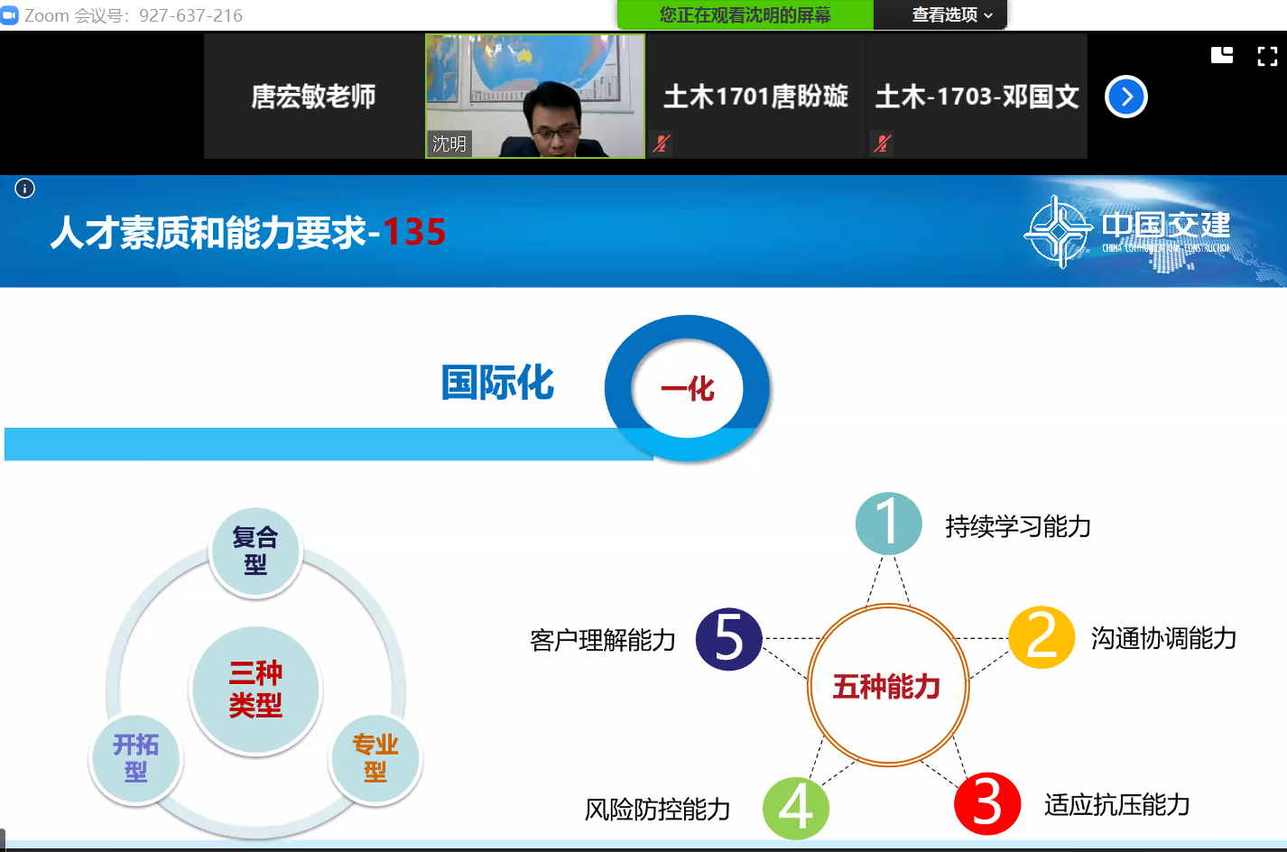 沈明以“勇担使命,实现梦想——关于“一带一路”倡议背景下国际化土木工程人才走出去的交流”为题,从为什么“走出去”、怎样“走出去”、“走出去”需要什么样的人才三方面讲述了我国海外土木工程项目发展现状和趋势,大型企业对国际化土木工程专业人才的需求,并对在校土木工程专业大学生的学习提出建议,叮嘱同学们在疫情防控期间不要放松学习,珍惜学习时光。最后,他还在线耐心地回答了同学们的提问,与同学们进行了深入的交流与互动。