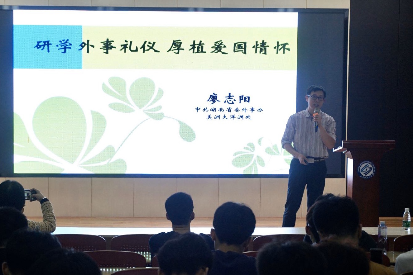 5月25日晚,国际学院在工科三号楼A201开展了“成长训练营”暨职业与人生大讲堂活动,由湖南省人民政府外事侨务办公室美洲大洋洲处处长廖志阳主讲,来自国际学院各年级的近200名学生参与本次活动。